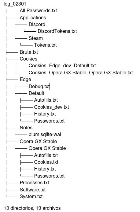 Los logs robados suelen contener una gran variedad de información sensible y confidencial que los atacantes pueden usar para acceder a tus cuentas, suplantarte o causar daños.. A continuación puedes ver un ejemplo típico del árbol de archivos de un log, donde se clasifican los datos obtenidos del equipo infectado:
