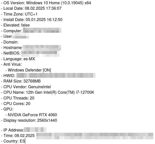 - Información del sistema → Detalles técnicos que facilitan ataques personalizados o la instalación de más malware.